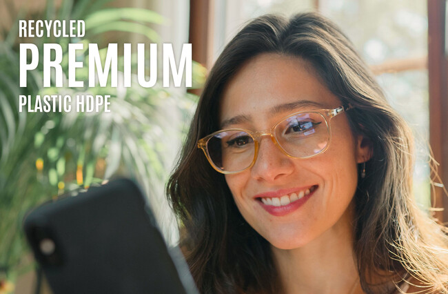 フレームは、環境に優しい素材リサイクルHDPE(プラスチック)100%で作られています。耐久性に優れた軽量なメガネで、ブルーライトカットのみの0から2.50まで5つの度数をお選びいただけます。ポリカーボネート製のレンズは反射防止加工に加えて、電子機器から発せられる目に有害なブルーライトをフィルタリングします。