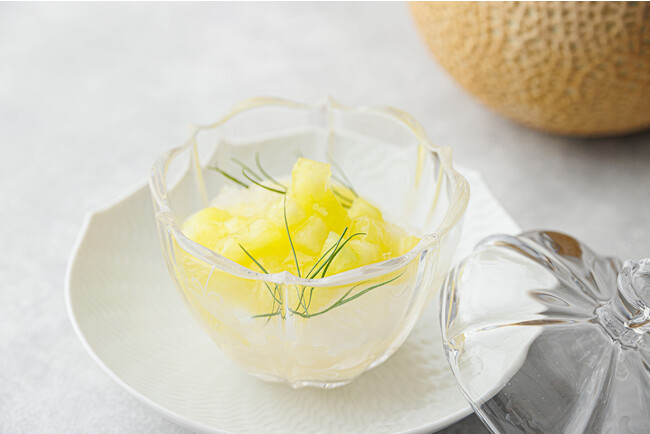 ディルのブランマンジェ、エルダーフラワーのジュレ、シェリー酒のグラニテにフレッシュメロンとメロンソースを添えて。