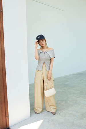 直線的なオフショルダーやタイに、柔らかなドレープ、クロップド丈のバランスなど、
