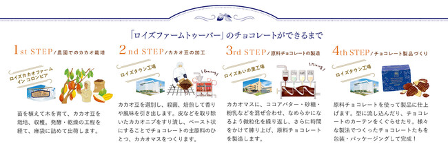 コロンビアの人たちとともに開拓した自社農園(Farm)、そこで大切に育てたカカオ豆を使い、自らの工場で一貫してつくりあげたチョコレート(Bar)。農園づくりからカカオの栽培、カカオ豆の加工、チョコレート製品にいたるまでのすべての工程を手がけ、追い求めたチョコレートがロイズファームトゥーバーです。