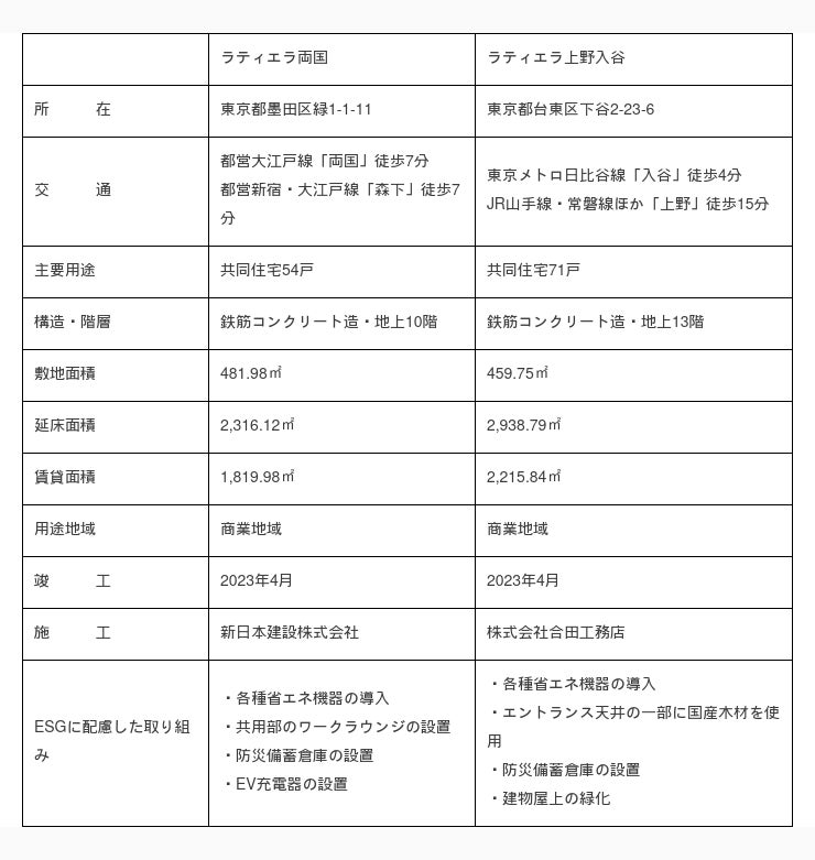 東京ガス不動産株式会社(社長:穴水 孝、以下「東京ガス不動産」)は、このたび、賃貸住宅「ラティエラ両国(54戸)」、「ラティエラ上野入谷(71戸)」の2棟125戸を新たに取得しました。東京ガス不動産が提供する賃貸住宅の累計は、30棟、1,689戸となります。