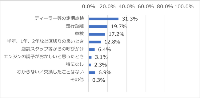 約半数(48.5%)が車検やディーラー等の定期点検をきっかけにエンジンオイル交換を行っている。