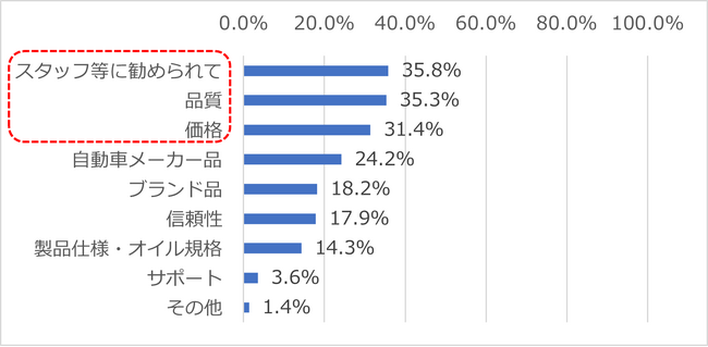 エンジンオイルを選定するときの決め手は「スタッフに勧められて」が35.8%以上を占める。