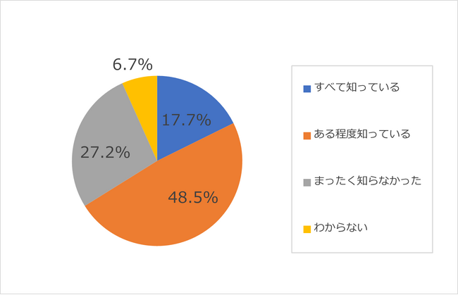 「エンジンオイル交換の効果は大まかに言うと次のとおりです。1 潤滑効果(エンジンを長持ちさせる)2 冷却作用(高熱・摩擦による不具合を防ぐ)3 密封作用(エンジン内のエネルギーを外部に漏らさない)4 洗浄作用(エンジン内汚れを吸収)5 防錆作用(金属の錆を防ぐ)これについて、ご存知でしたでしょうか?(n=390)」という問いに対し、17.7%が「すべて知っている」、48.5%が「ある程度知っている」と回答した(あわせて66.2% )。一方で、27.2%が「まったく知らなかった」と回答した。