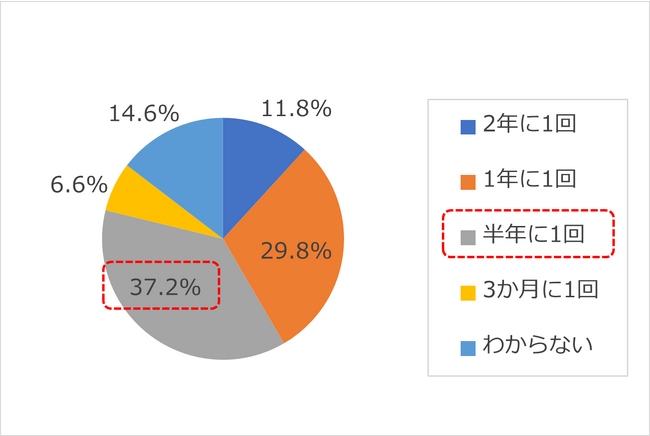 「愛車のオイルの交換頻度はどれくらいですか?(n=363)」という問いに対して、「半年に一回」という回答が37.2%と一番多いという結果になった。2年ごとの乗用車の車検間隔よりも頻繁にオイル交換を行っている人が多いという結果となった。