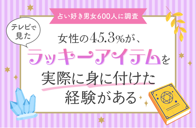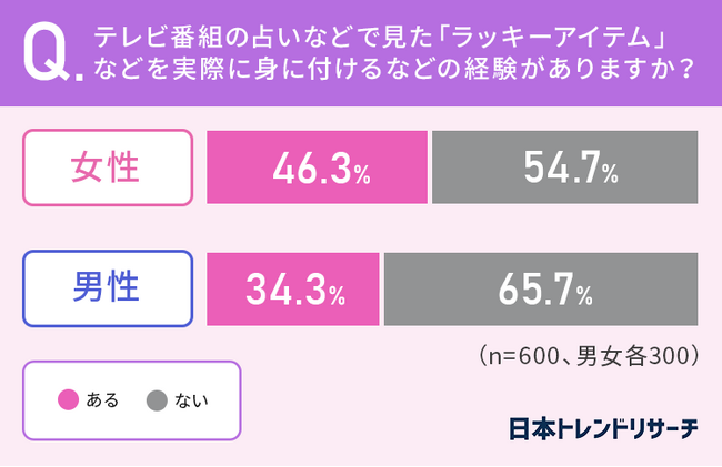 女性の45.3%、男性の34.3%が、テレビ番組の占いなどで見た「ラッキーアイテム」などを実際に身に付けるなどの経験が「ある」と回答しました。