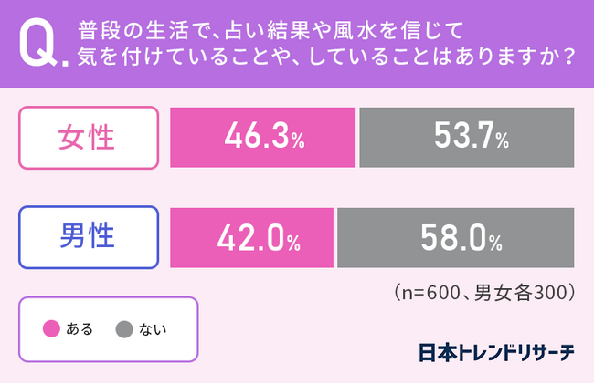 女性の46.3%、男性の42.0%が、占い結果や風水を信じて気を付けていることや、していることが「ある」と答えています。
