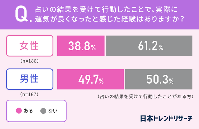 女性の38.8%、男性の49.7%が、占いの結果を受けて行動したことで、実際に運気が良くなったと感じた経験が「ある」と回答しています。