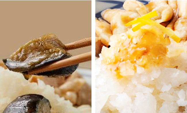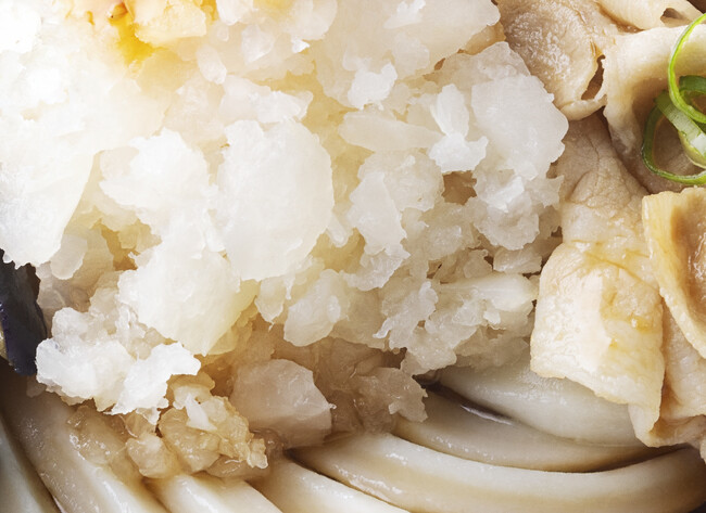 『鬼おろし豚しゃぶぶっかけうどん』をより一層おいしくするために欠かせないなすの揚げ浸しは、醤油の効いた濃いめのだしに付け込み、だしの旨みをたっぷりと染みこませています。ひと噛みすれば、じゅわりと旨みが広がります。彩りの良い刻み柚子は、爽やかな香りが鼻から抜け、さっぱりとした清涼感をもたらします。
