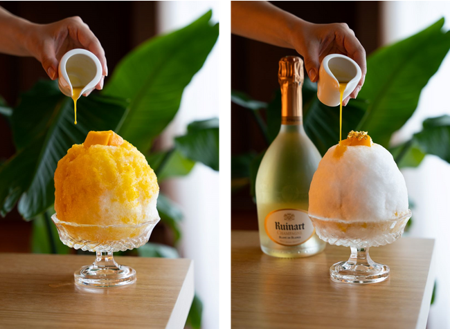 夏に旬を迎える最高級の国産マンゴーを使った2種類のプレミアムなかき氷。味、香りの良いマンゴーを選りすぐり創り上げたシェフ特製のシロップ、そしてトッピングのフレッシュマンゴーでジューシーな味わいを存分にお愉しみいただけます。氷に忍ばせた、レモングラス、レモンバーム、スペアミントのハーブゼリーが爽やかさをプラスします。 シャルドネの芸術と称されるメゾンのフラッグシップであるルイナール ブラン ド ブランをふわふわの氷に仕上げ、マンゴーとともにご堪能いただくエレガントなシャンパーニュかき氷もご用意しました。