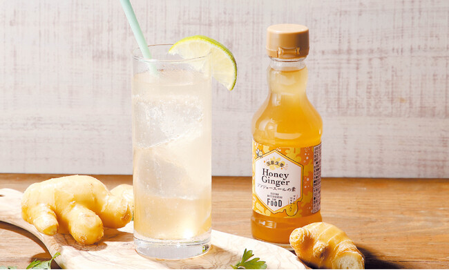 生姜汁と生姜シロップの2種類を使用しています。生姜シロップは選定にこだわった国産の生姜スライスをじっくり1時間以上炊き込み、生姜の風味と香りを追求しました。生姜の個性をいかしながらも、はちみつとレモン果汁によってスパイシーになりすぎないように工夫し、小さなお子様にも飲みやすく、ご家族で楽しんでいただける味わいに仕上げました。