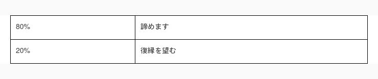 恋するうさぎ編集部が行った『忘れられない元彼と復縁するか諦めるか』のアンケートによると80%が『諦める』、20%が『復縁を望む』という結果になりました。