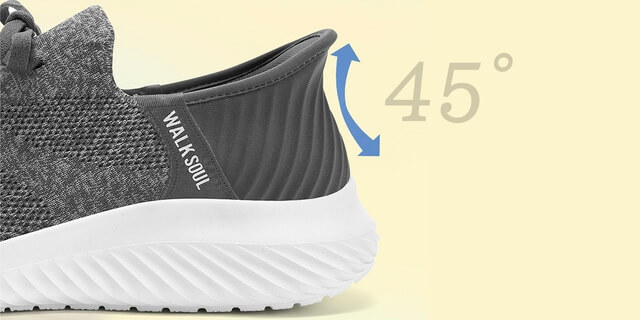 かかと部分を立体的な硬巻で弾力のある素材で作成し45℃の湾曲を付けています。