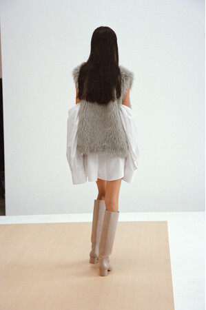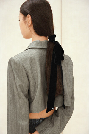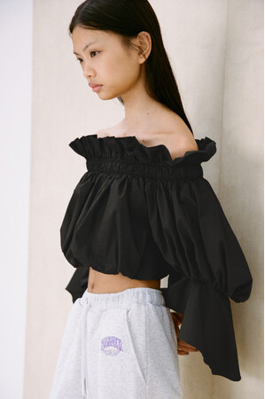 直線的なオフショルダーやタイに、柔らかなドレープ、クロップド丈のバランスなど、