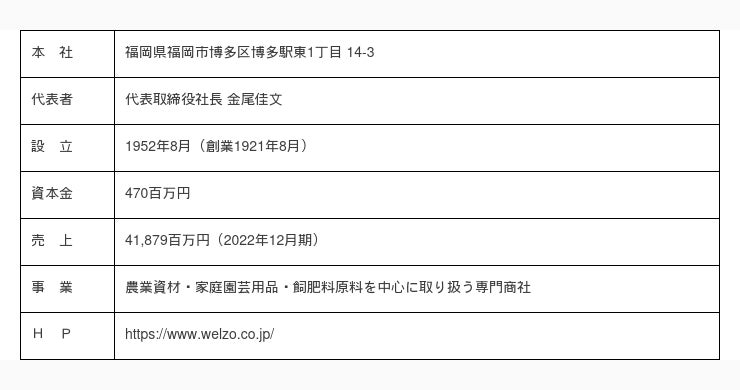 食・農業を通して、持続可能な社会と人々の暮しを豊かにする商品やサービスを提供する、農業資材・家庭園芸用品・飼肥料原料を中心に取り扱う専門商社です。2022年で創業 101 年を迎えたニチリウ永瀬は、2023年1月1日をもって、「株式会社welzo」に社名を変更。BtoB を中心としたビジネススタイルを築き、国内に 19 拠点を置いています。