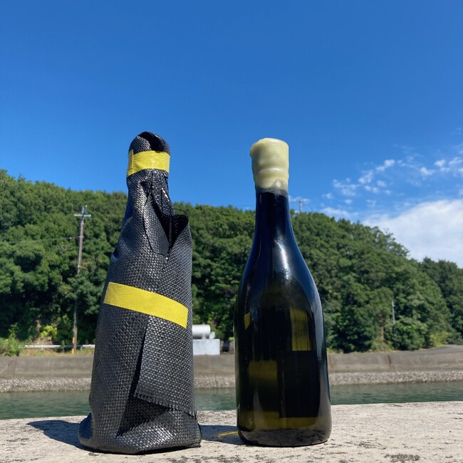 海底熟成酒用に、通常より厚めの水圧に耐えられる瓶を使用しております。金属の栓は海水で錆びてしまう事から、プラスチックのものを使用しさらに蝋で密封、また紫外線による風味劣化防止と生物の付着を避ける為一本一本カバーを巻いております。