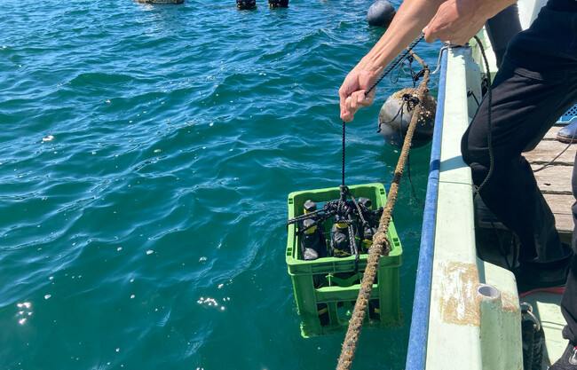 2023年7月20日(木)に実施した3回目の沈下作業では、2016年G7首脳会議「伊勢志摩サミット」で乾杯酒を提供した大田酒造(伊賀市)の「半蔵 特別純米酒」約250本を英虞湾の真珠養殖のいかだにつるして海底約20m地点に沈下しました。