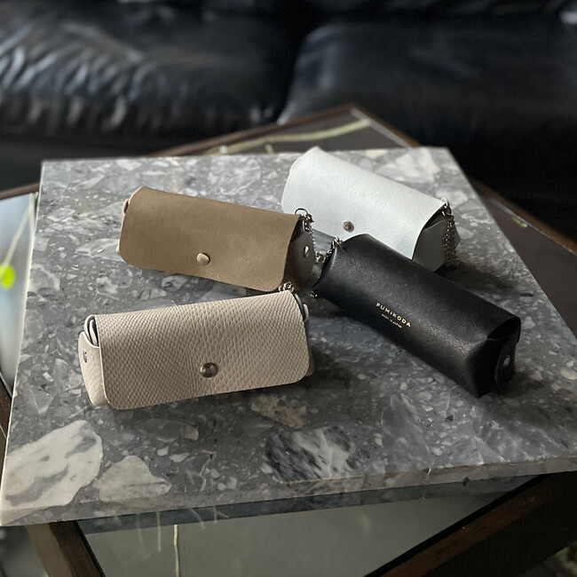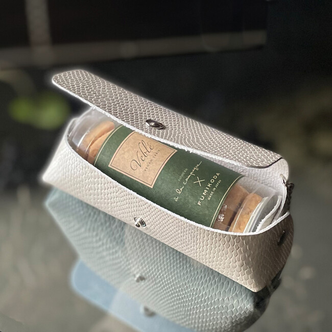 パッケージはできるだけ廃棄を避けるためリユース可能なケースを採用。FUMIKODAのバッグの生産過程で余ったヴィーガンレザーをアップサイクルして制作しています。「Veble」(ヴィブレー)を召し上がった後にもメガネケースやメイクポーチとしてもリユースいただけます。