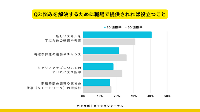 悩みを解決するためには、「新しいスキルを学ぶための研修や教育」が必要と選択したのは、20代の40.7%、30代の31.0%でした。また、20代で21.3%、30代で25.8%が「明確な昇進の道筋やチャンス」が必要と回答しています。