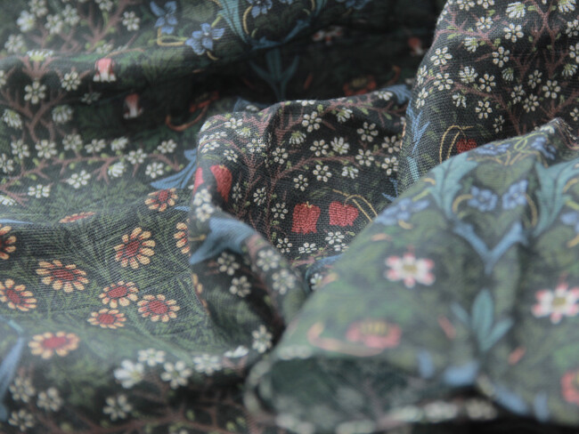「Blackthorn(ブラックトーン)」は、1892年にモリスの弟子であるジョン・ヘンリー・ダールによってデザインされました。このパターンは、モリスの好んだイギリスの花、ブラックトーンやスミレが多彩で瑞々しく描かれたデザインです。まるでお花畑を眺めているかのような空間が広がります。