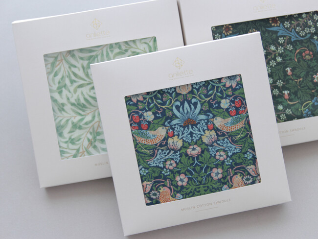 「大人と子どもが一緒に笑顔に」がコンセプトのベビーギフトブランド「Anliette/アンリエット」(運営会社:株式会社エフ・エヌ・ディー、所在地:東京都中央区)は、オリジナル乳児用おくるみ「花束スワドル」の新作として、ウィリアム・モリスの『いちご泥棒』『ウィローボウ』『ブラックトーン』の3種を、2023年7月25日(火)よりAnlietteオンラインストアにて販売開始しました。高級感のある箔押しロゴの窓付きパッケージは、出産祝いにも最適です。