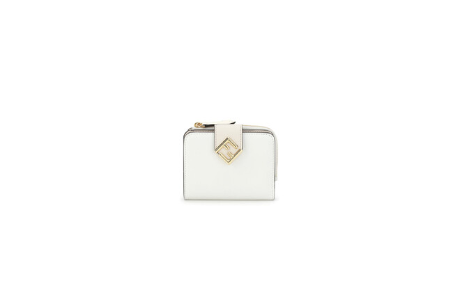 若々しくフェミニンなコレクション「FF ダイヤモンド」は、ダイアゴナルに施されたアイコニックな「FF」ロゴのクロージャーと鮮やかなカラーブロッキング、フェンディのデュアリズムを表現したツートーンカラーというデザイン性に加え、必要不可欠な機能をカバーするミニマムなスタイルが特徴の、メゾンのアイコンウォレットです。今季は洗練されたトーン・オン・トーンのほのかなバイカラーを、スムースレザーとグレインレザーの組み合わせにより創り出しています。