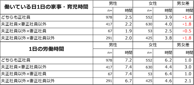 【図3】働いている日の家事・育児時間平均の男女比較と1日の労働時間平均の男女比較