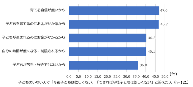 子どもが欲しくない理由は「育てる自信がないから(47.0%)」と「子どもを育てるのにお金がかかるから(46.7%)」がほぼ同値で、精神的な不安と経済的な不安が見られる【図4、5】