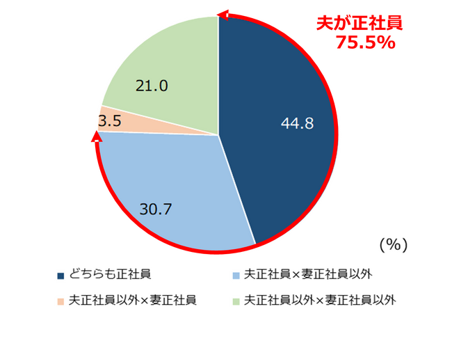 16歳~64歳の既婚者に対して自身と配偶者の働き方について聞くと、共働き世帯は73.6%となった。共働き世帯の内訳をみると、「夫婦ともに正社員」が44.8%、「夫が正社員・妻が正社員以外」が30.7%で、夫が正社員の割合を合計すると75.5%で全体の4分の3を占めた。
