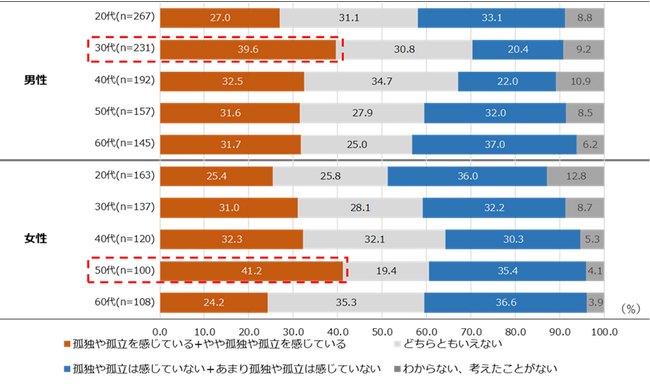 独身一人暮らしで私生活に最も孤独や孤立を感じる年代は男性が「30代(39.6%)」、女性が「50代(41.2%)」【図6、7】