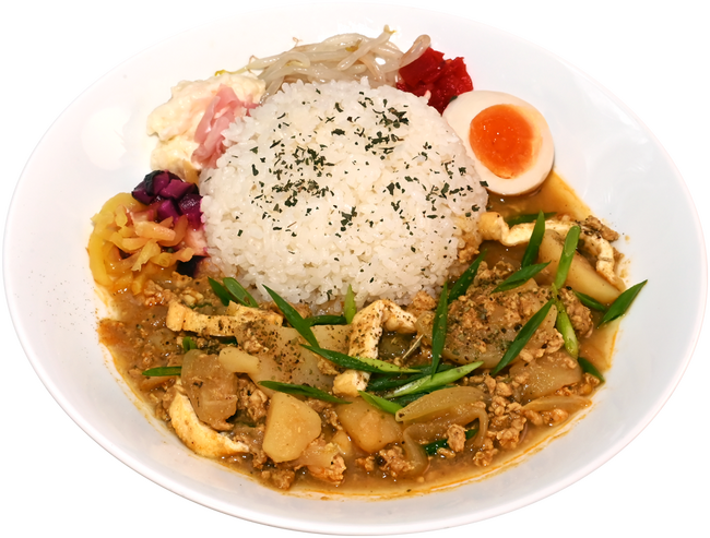 出汁カレー。和風の出汁をしっかりと効かせたソースと具の鶏ひき肉のダブルの旨味。トッピングに煮卵・お新香・もやしナムル・生姜ポテト・福神漬けを加えた、和風スパイスカレー。