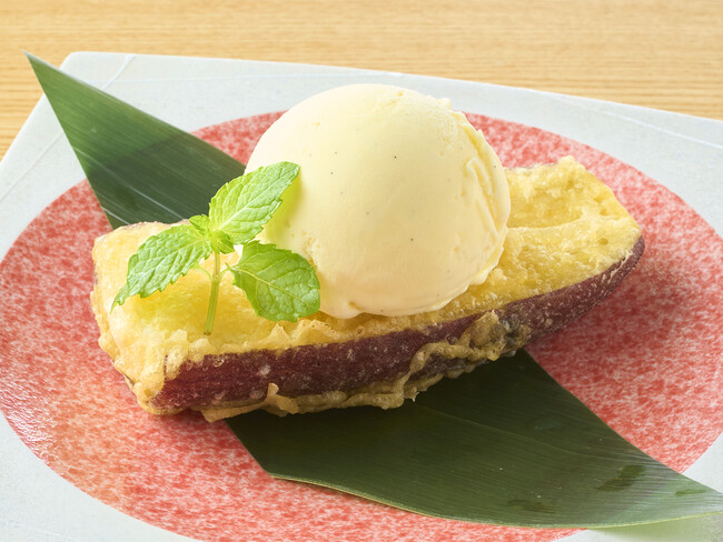 揚げたてのさつめ芋の天麩羅とひんやり冷たいバニラアイスクリームを合わせたスイーツ♪