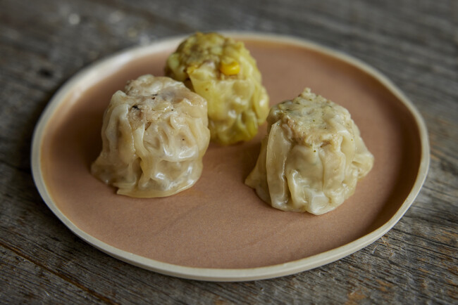 「焼売は、『O2』ではアラカルトで出しているメニューです。今回のお弁当でおたのしみいただくのは、ベーシックな『豚と黒コショウ』、夏らしい『トウモロコシとスパイス』、香りの余韻をたのしむ『鶏とレモングラス』の3種類です。お店では蒸したてですが、今回は冷めてもおいしくなければならない。お弁当で輝く焼売。そして、ごはんが食べすすむおかずにこだわりました」(大津シェフ)