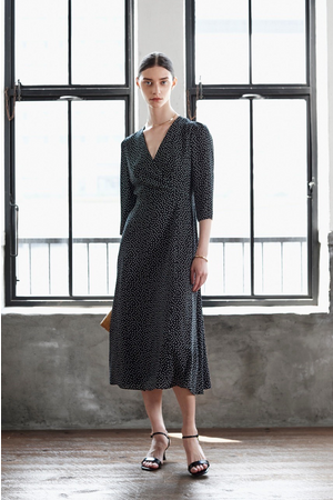 MARIHAで大人気の「マドモアゼルのドレス」をベースに、エレガントさを保ちつつ着心地にこだわりデザインをアップデート。更に着丈や袖を改善し、ブランドらしいドット柄をのせたスペシャルなドレス。