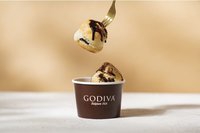 フワッと軽いシュー生地、なめらかな口どけのアイスクリーム、サクサクしたビスケット、そこにゴディバの濃厚な味わいのチョコレートソースがかかり、ゴディバカフェでしか味わうことができない、冷たいシューアイスと温かいチョコレートソースの絶妙なコンビネーションが生まれました。