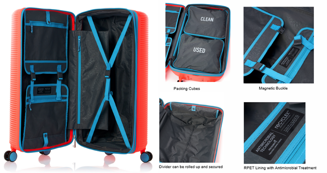 スーツケース2型とバッグ3型の全5型で展開し、スーツケースにはそれぞれに“CLEAN”と“USED”と書かれた半円状のユニークなパッキングキューブが2つ付属しており、衣類を分けて収納することができます。また、内装には荷崩れ防止のディバイダ―とクロスストラップや、ポケット類などの収納をサポートする機能を各所に搭載しています。