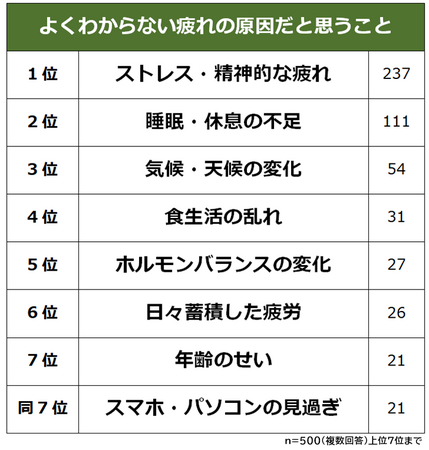「よくわからない疲れの原因は何だと思うか?」と聞いたところ、1位は「ストレス・精神的な疲れ(237人)」で、半数近くにのぼりました。