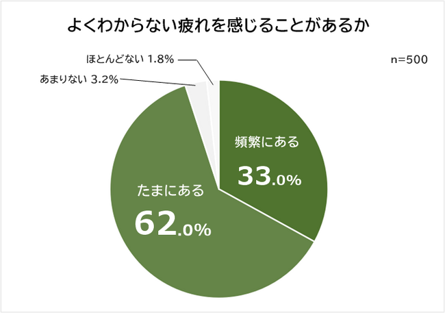 全国の男女500人に「よくわからない疲れを感じることがあるか」を聞いたところ、「頻繁にある」「たまにある」と答えた人が合わせて95.0%となっています。