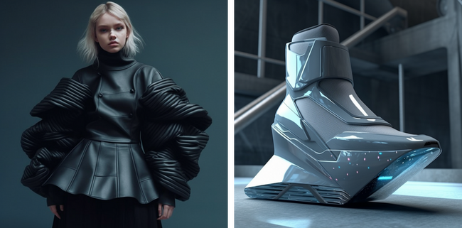今回、ファッションブランド「accelerando.Ai」より販売開始したアイテムは2点です。1点目は今年6月に開催され、120通以上の応募があったデザインコンテスト「accelerando.Ai – AI FASHION CHALLENGE #2」で選ばれたデザインをベースにしたシューズアイテムと、メタバース空間のアイテムだからこそ実現できた、腕のデザインが特徴的なウェアです。