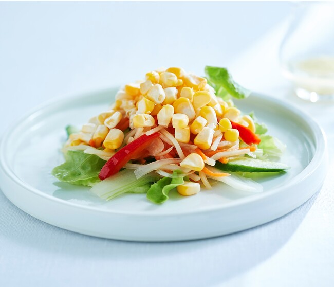 粒がびっしり、甘くて皮のやわらかなとうもろこし「ゴールドラッシュ種」の食感と風味をシンプルに楽しむサラダです。塩レモンのペーストとレモン果汁でスッキリと仕上げた「まろやか塩レモンソース」が、コーンの甘みや加熱した野菜の味わいを引き立てます。