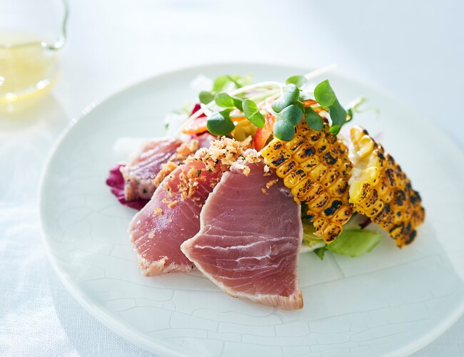炙ったマグロと、グリルした甘みのあるとうもころし「味来」を組み合わせたサラダです。別名「ミラクルスイートコーン」とも呼ばれる「味来」は、粒の皮が柔らかく食べやすいことも特長。アボカドポテトソースとレモンドレッシングで夏らしく爽やかな味わいに。