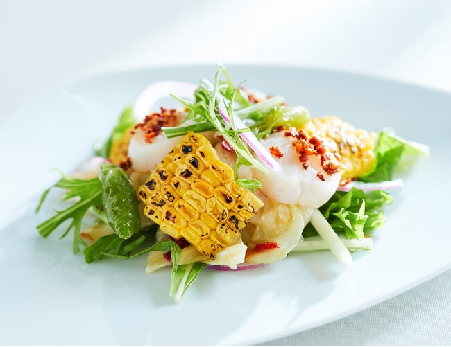 北海道産帆立とフルーティーでコクのあるとうもろこし「恵味」が主役のサラダ。とうもろこしと相性の良いバターソースに醤油を加えた、食欲をそそる夏の味わいです。揚げた甘長とうがらしの香りも、旨み豊かなバターソースを引き立てます。