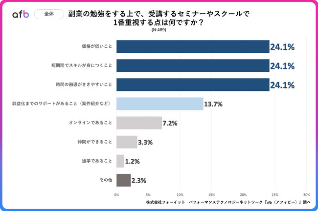 事前調査で「副業をしたことがある」と回答した10代~60代の男女を対象に、「副業の勉強をする上で、受講するセミナーやスクールで1番重視する点は何ですか?」というアンケートを実施したところ、最も多かった回答は「価格が低いこと」、「短期間でスキルが身につくこと」、「時間の融通がききやすいこと」の3つがともに24.1%という結果でした。次いで、「収益化までのサポートがあること(案件紹介など)」が13.7%、「オンラインであること」が7.2%と続きました。また、最も少なかった回答は「通学であること」で、1.2%となっています。