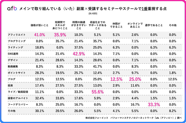「メインで取り組んでいる(取り組んでいた)副業は何ですか?」という質問の回答と、「受講するセミナーやスクールで1番重視する点」をかけ合わせると、上図のような結果となりました。