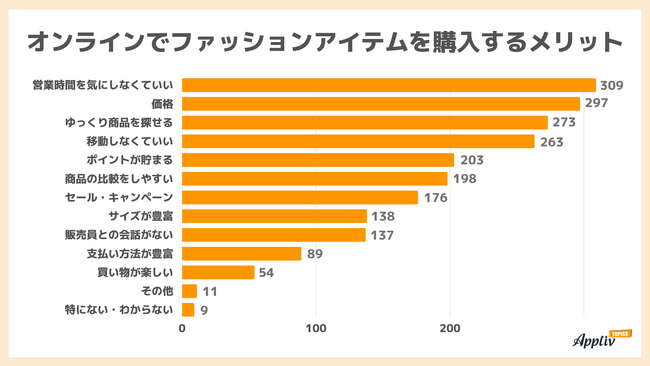 最多は「営業時間を気にしなくていい」。都心のファッションビルは遅い時間まで営業しているところもありますが、早い時間に閉店するアパレルショップも多いです。日々忙しい中で、営業時間に合わせて実店舗へ行けないという方は多いのではないでしょうか。「ゆっくり商品を探せる」の回答も多く、営業時間ギリギリに店舗へ行くのは気が引けるという面もあるかもしれません。