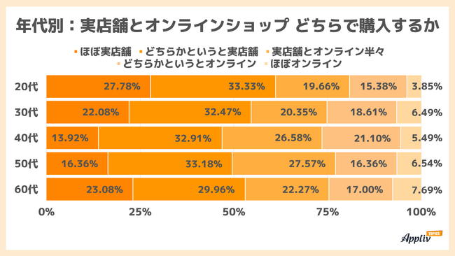 年代別で見ると、「ほぼ実店舗」の回答が最も多かったのは20代、最も少なかったのは40代でした。40代・50代は「実店舗とオンライン半々」が比較的割合が大きく、他の年代よりもオンラインショップを利用している傾向にあります。