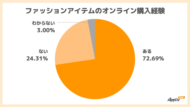 洋服、靴、バッグなどのファッションアイテムをオンラインで購入したことがあるかを尋ねたところ、72.69%が「ある」と回答しました。