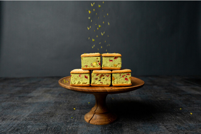 「ナッツの女王」ピスタチオをふんだんに使った贅沢な味わいのカッサータを、アーモンドの香ばしさが楽しめるサブレでサンドいたしました。この機会にぜひお試しください。