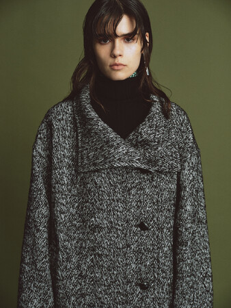 イタリアのテキスタイルメーカー“Bisenzia”の迫力あるヘリンボーン素材を使用したファネルネックコート。インポートならではの質感と柄でコーディネートの主役になる一着。オープンにしてトライアングルカラーのように着用するのもおすすめ。シンプルなスタイリングを際立たせる洗練されたコートです。