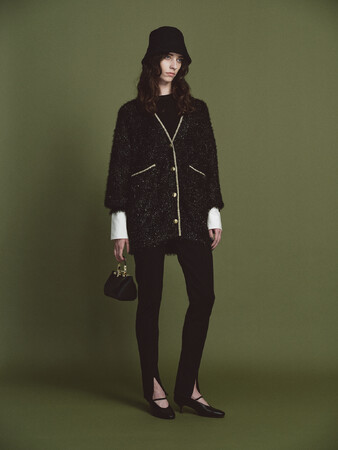 今期トレンドのシャギー感とキラキラ感を反映したニットカーディガンを主役に、シンプルにまとめるのがおすすめ。前立てはゴールドのコイルヤーンでチェーン風にパイピングし、シャギーのキャッチーなムードを大人っぽく締めるアクセントに。